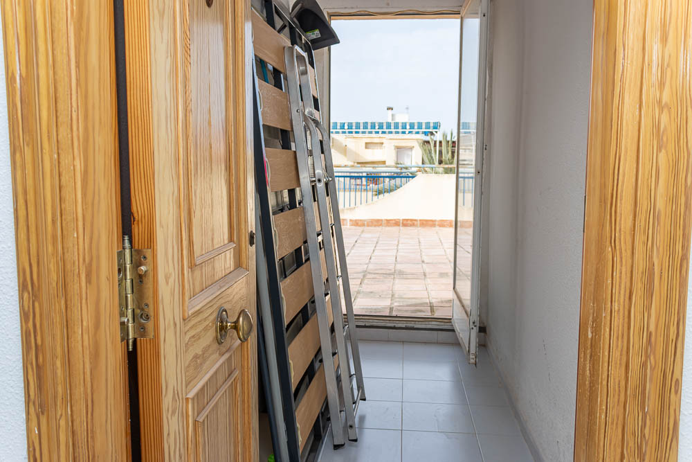 Pero la verdadera joya de la corona de esta propiedad se encuentra en la parte superior. Subiendo un único tramo de la escalera comunitaria, accederás a un espacio exclusivo: un espectacular solarium privado de aproximadamente 85 m2, una superficie casi idéntica a la de la propia vivienda. Antes de salir al exterior, una inteligentemente diseñada habitación-trastero te permitirá guardar de forma segura y proteger del sol todo el mobiliario exterior cuando no lo utilices. Una vez en el solarium, podrás deleitarte con unas maravillosas vistas al mar Mediterráneo y a la zona de piscina del residencial, creando el escenario perfecto para cenas de verano, tomar el sol o simplemente relajarte bajo el cielo estrellado.