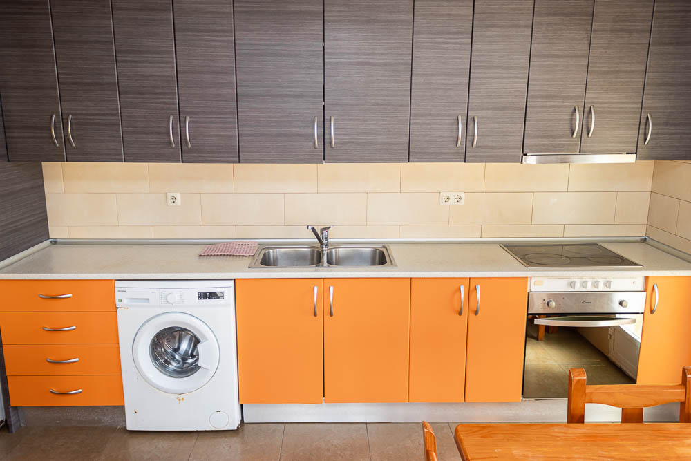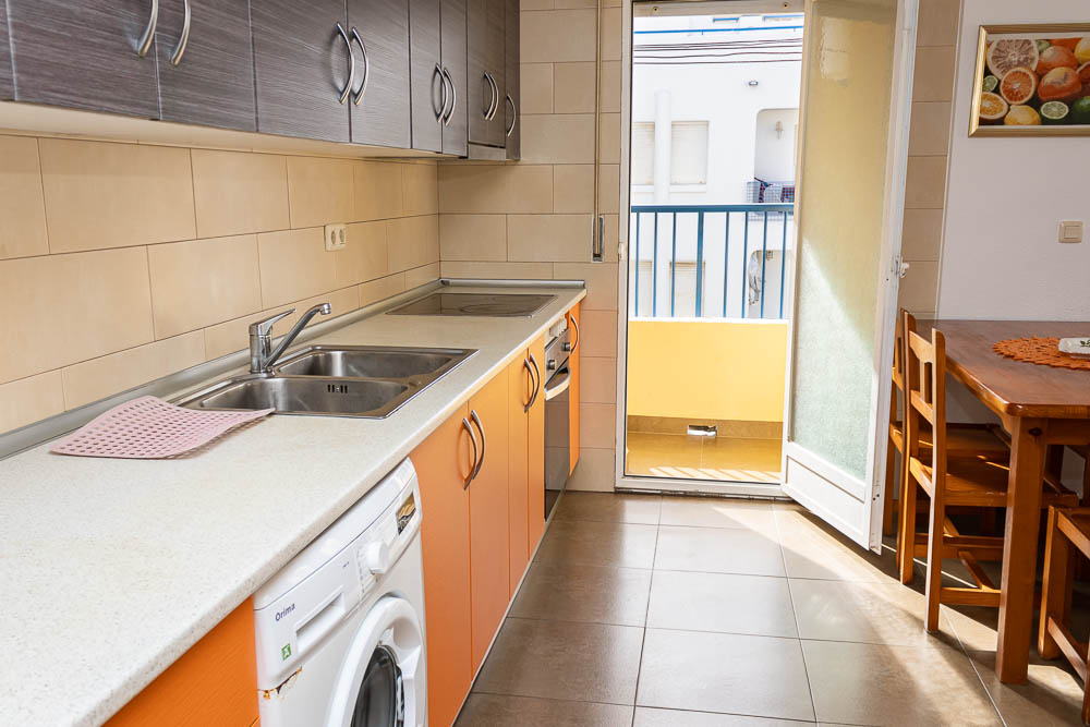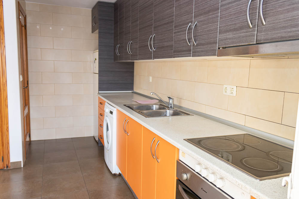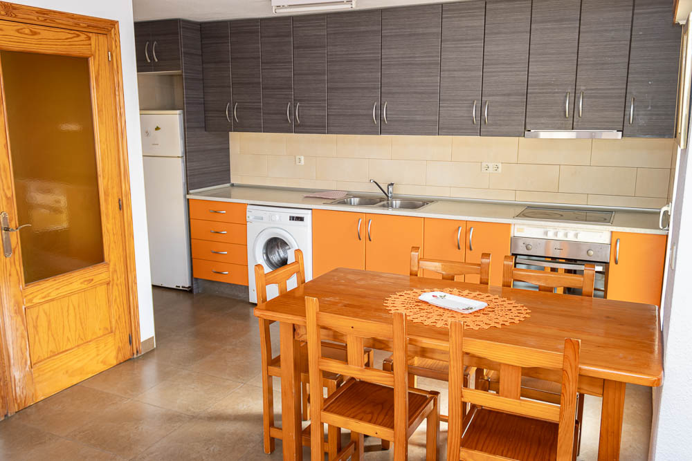 El corazón del hogar es, sin duda, su amplísimo salón-comedor. Situado en esquina, este espacio goza de una inmensa entrada de luz natural. Su fachada principal disfruta de orientación Oeste, garantizando un cálido y envolvente sol de tarde, mientras que el lateral cuenta con orientación Norte, permitiendo una excelente ventilación cruzada. Desde el salón, tienes acceso directo a un balcón privado con encantadoras vistas a la piscina comunitaria. Perfectamente integrada en este ambiente se encuentra la espaciosa cocina de concepto abierto, meticulosamente cuidada y completamente equipada. Esta cocina da paso a un coqueto balcón trasero que hace las veces de lavadero, un espacio muy funcional donde podrás tender la ropa y donde se aloja el calentador de agua eléctrico de la vivienda.