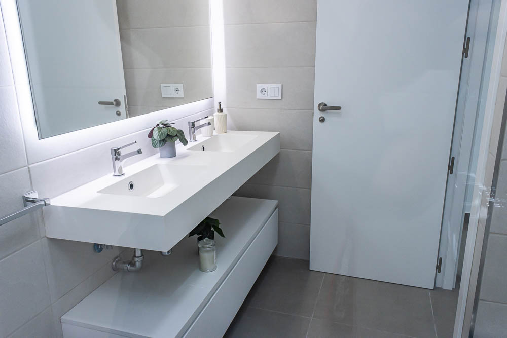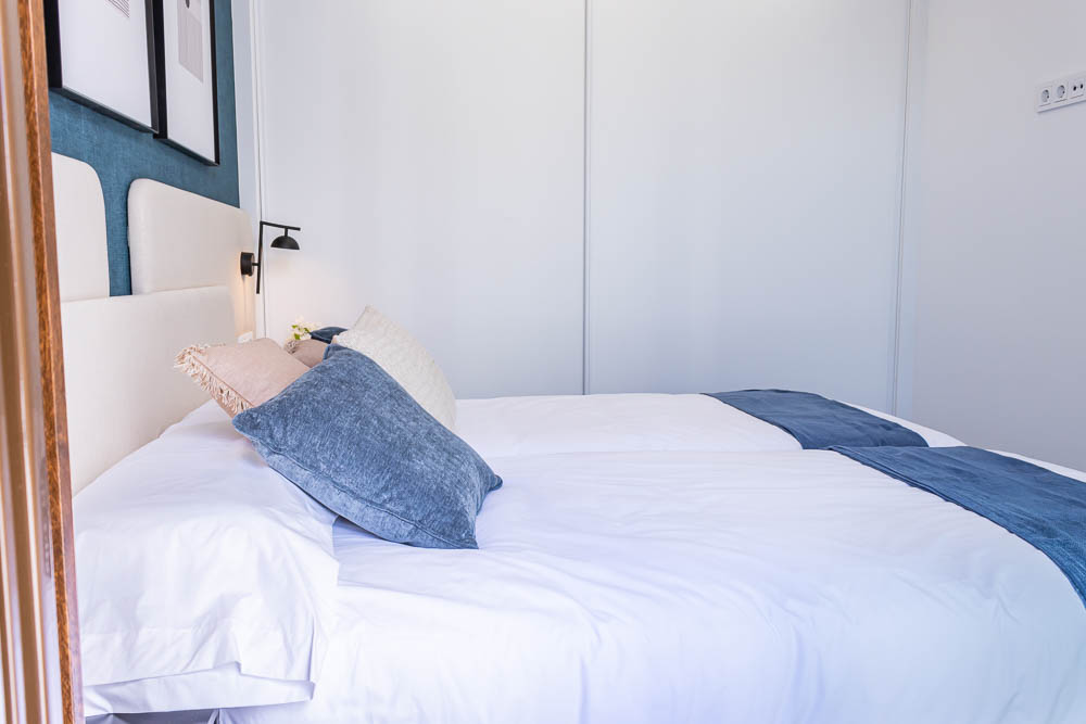 La planta superior está dedicada al descanso. Aquí encontramos dos dormitorios adicionales, ambos de gran tamaño, dobles y equipados con armarios empotrados. Ambos tienen acceso directo a una magnífica terraza de 58 m² orientada al sur, donde el sol es protagonista durante todo el año. En este nivel se ubica un segundo cuarto de baño completo. La joya de la corona es, sin duda, el solárium privado de 42 m² en la planta superior, accesible mediante un lucernario eléctrico, que ofrece espectaculares vistas al mar y al entorno natural.
