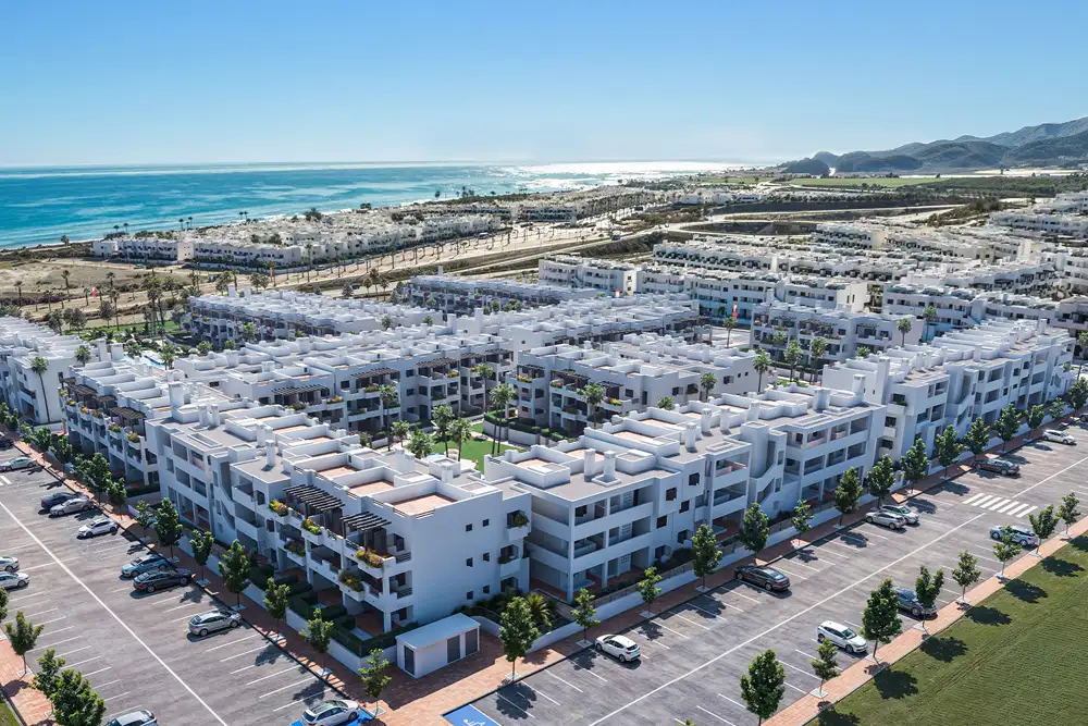 El nivel de acabados y el equipamiento en la Fase 9 de Mar de Pulpí han sido seleccionados para garantizar la excelencia. Cada vivienda se entrega con una cocina de diseño moderno, completamente amueblada y equipada, que destaca por incorporar elegantes y resistentes encimeras de Silestone. Pensando en su confort térmico absoluto durante todas las estaciones del año, el inmueble incluye un sistema de aire acondicionado de frío y calor totalmente instalado mediante conductos. Aunque las propiedades se entregan vacías para permitirle personalizar cada espacio, ponemos a su disposición paquetes de mobiliario opcionales para facilitar su instalación. Su tranquilidad es primordial, por lo que se incluye una puerta principal de alta seguridad y, para su máxima comodidad, cada vivienda cuenta con su propia plaza de aparcamiento privado.