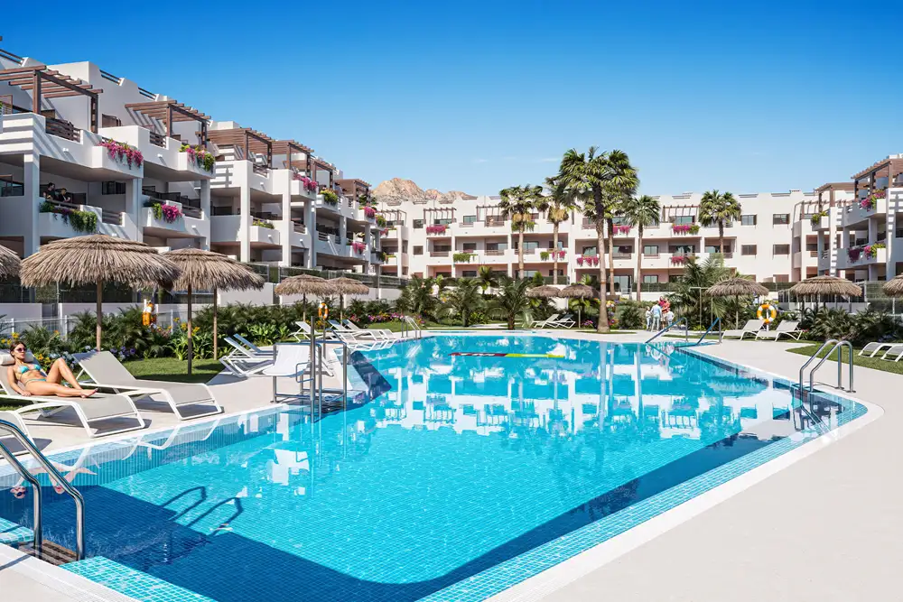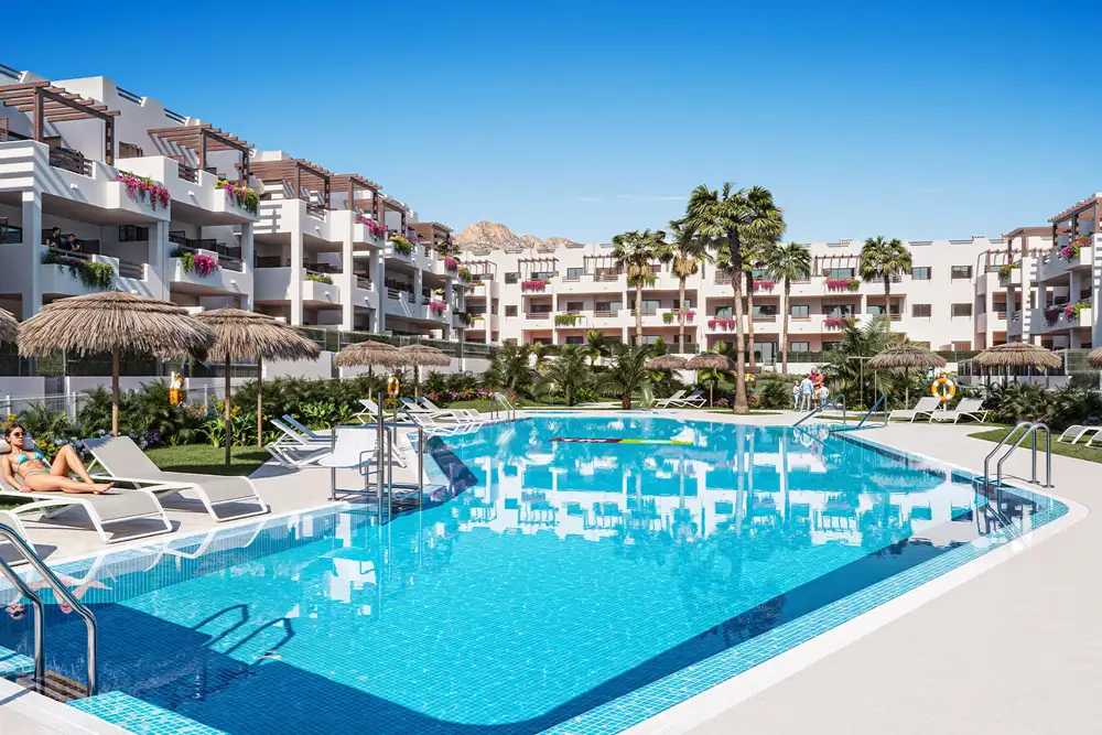 En esta ocasión, centramos nuestra atención en las joyas más amplias de la promoción: nuestras magníficas viviendas de tres dormitorios y dos cuartos de baño completos. Esta configuración espacial es la elección definitiva para familias numerosas, para quienes adoran recibir invitados o para aquellos que requieren estancias adicionales para despachos o zonas de juego. Situadas a una cómoda distancia de paseo, a unos 700 metros de la playa, estas viviendas se presentan en diferentes tipologías arquitectónicas para satisfacer cualquier preferencia de estilo de vida. Podrá decantarse por espectaculares bajos que cuentan con un extenso jardín privado, el entorno ideal para que los niños jueguen con total seguridad; luminosos apartamentos en planta media que disponen de terrazas generosas, perfectas para cenas familiares al aire libre; o impresionantes áticos coronados por un amplio solárium privado, un oasis personal para disfrutar del sol y de vistas inigualables con la máxima privacidad.
