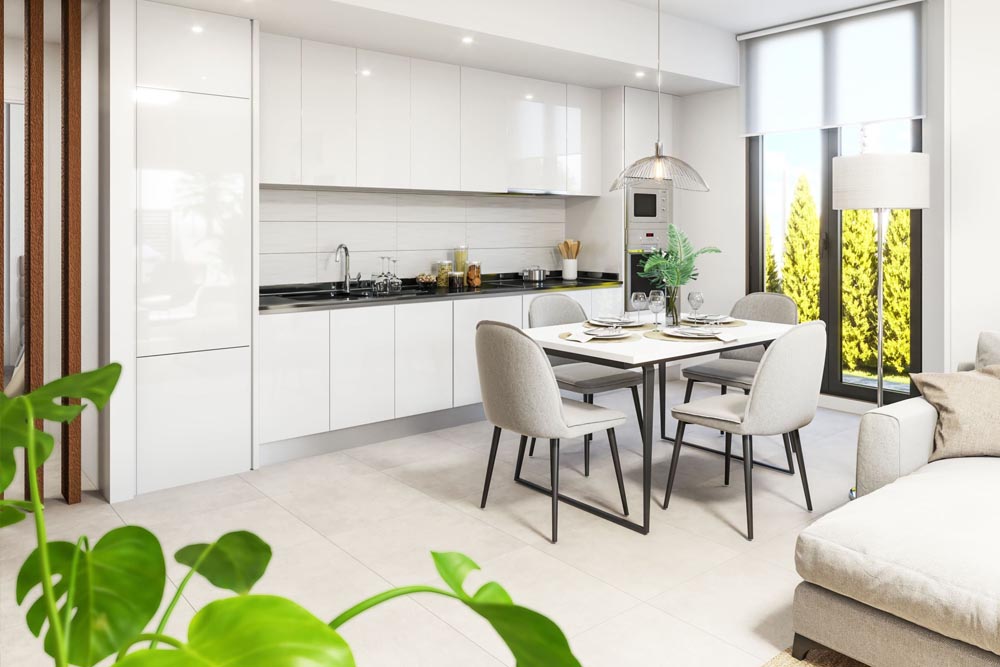 El acceso principal se realiza a través de un acogedor porche cubierto que da paso a un salón-comedor-cocina abierto de más de 33 m², concebido como el corazón de la vivienda. La cocina, totalmente equipada con electrodomésticos de gama alta, se integra de forma armónica en el espacio principal, conectándose visualmente con el jardín y la piscina a través de grandes ventanales correderos que aportan luz y continuidad entre interior y exterior.