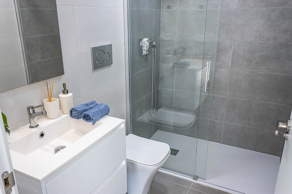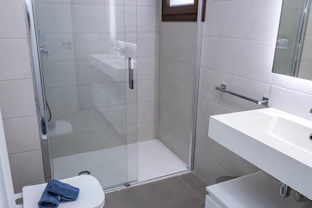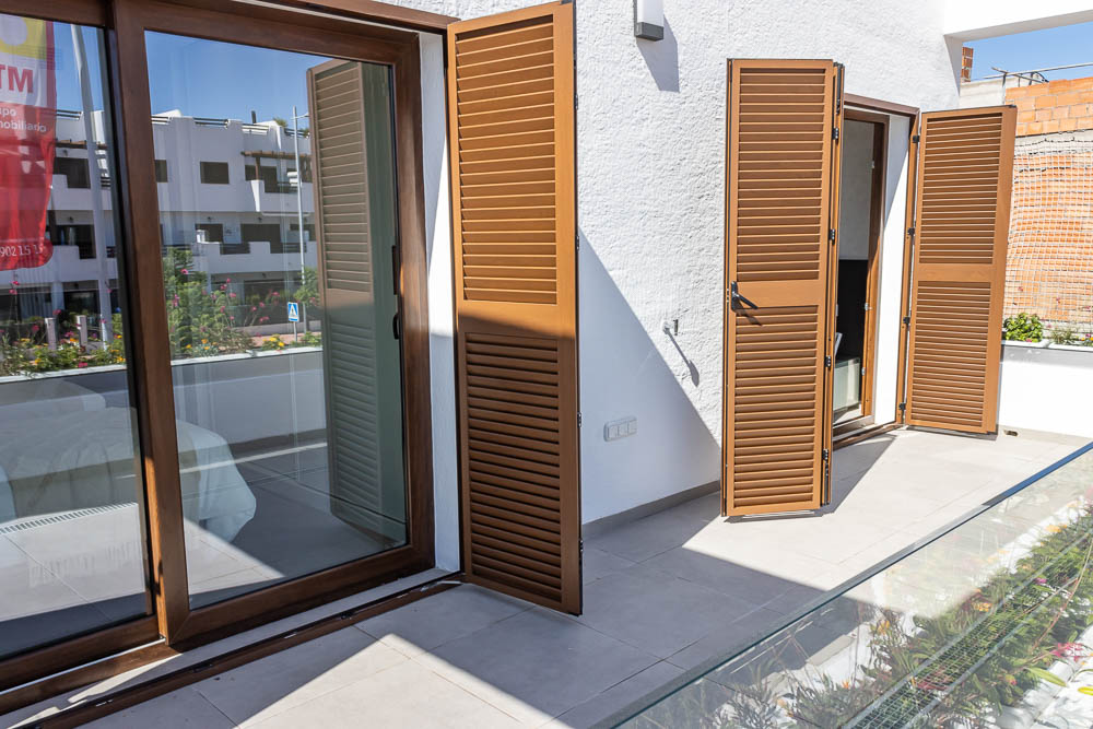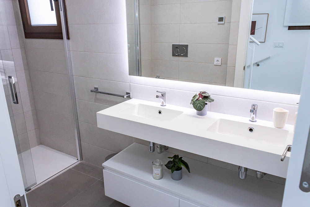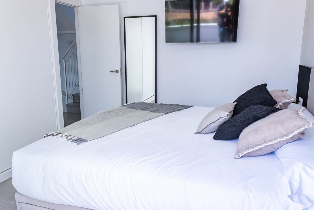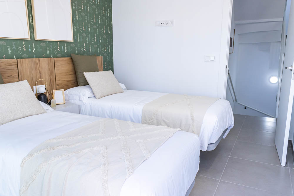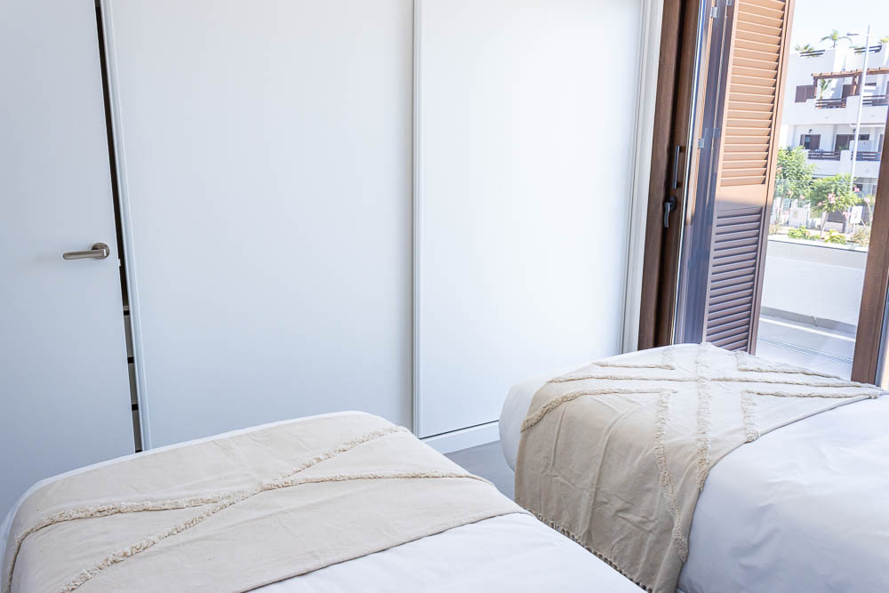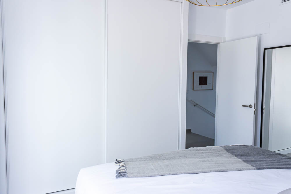 En la planta superior, la zona de descanso ofrece dos dormitorios dobles de gran tamaño. Ambos cuentan con armarios empotrados totalmente revestidos y salida directa a una amplia terraza orientada al sur, el lugar perfecto para despertar con el sol de Almería. En este nivel encontramos también un segundo cuarto de baño completo con acabados de alta calidad y plato de ducha.